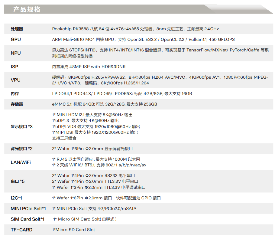 ? 新一代的AIOT芯片RK3588 八核64 位A76+A55 處理器,主頻高達2.4GHz,效能有大幅提升,用 8nm 先進工藝,具有低功耗高性能的特點。