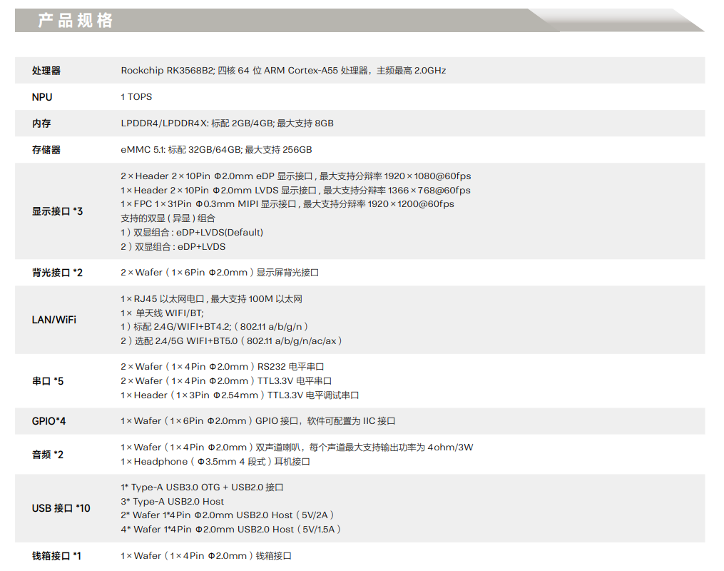 采用瑞芯微 RK3568 四核 64 位 Cortex-A55 處理器, 主頻最高2.0GHz,效能有大幅提升;采用 22nm先進(jìn)工藝,具有低功耗高性能的特點(diǎn)。